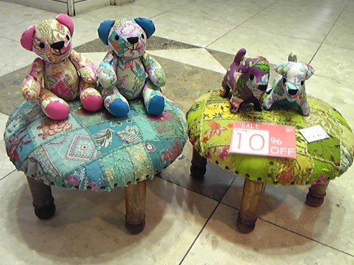 こんなパッチワークのかわいいスツールとくまちゃん&わんちゃんがお出迎え!!早速癒されますね・・・。